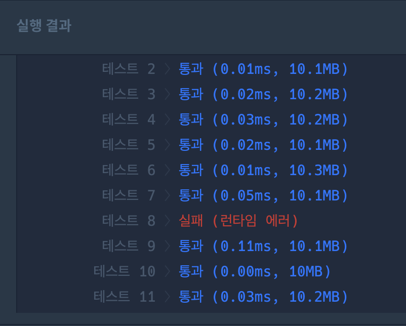위 조건의 범위가 커서 테스트 8번의 경우는 런타임 에러가 발생했습니다.