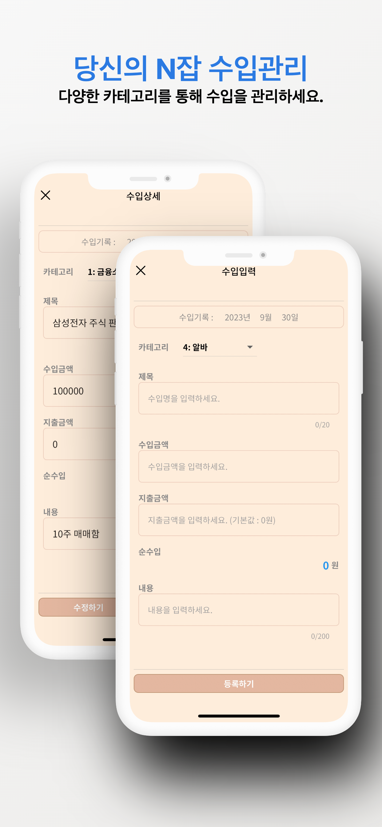 - N잡 수입 관리 N잡 수입을 기록하세요. 수입은 카테고리별로 관리할 수 있으며 메모를 남길 수도 있어요.