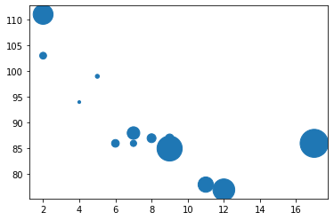 sizes = 10 * np.random.randint(100, size=(100)) # 임의의 사이즈 100개