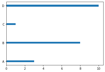 plt.barh(x, y, height = 0.1) # 가로 막대의 폭을 변경합니다.