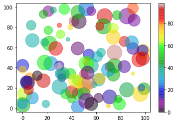 다음은 x- 포인트, y- 포인트, 색상 및 크기에 대해 100 개의 값이있는 임의 배열로 나타낸 예시입니다.