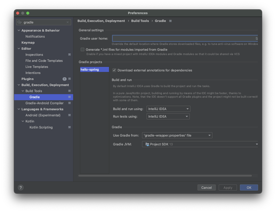 Preference → gradle 검색 → Build and run using, Run tests using을 Intellij IDEA로 변경 (더 빠른 수행을 위한 설정)