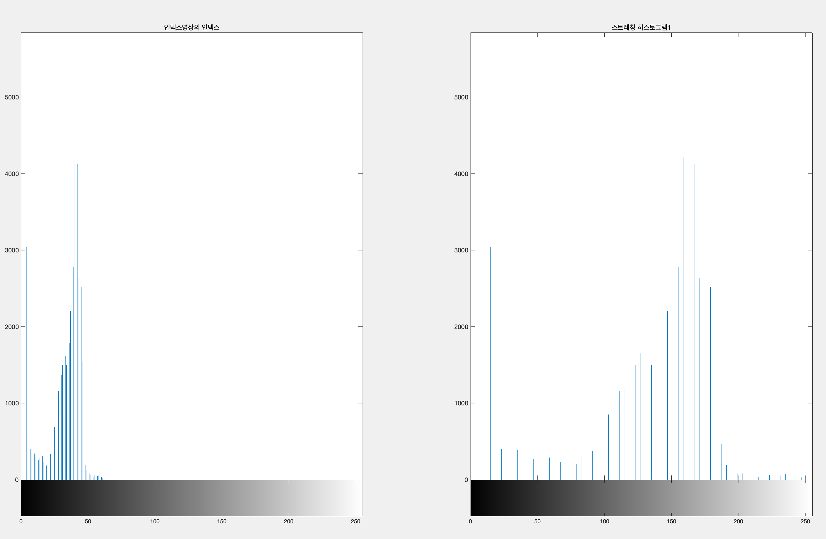 스트레칭 함수 hist1을 적용한 결과입니다. 다음은 원영상과 스트레칭 된 인덱스를 비교해보겠습니다.