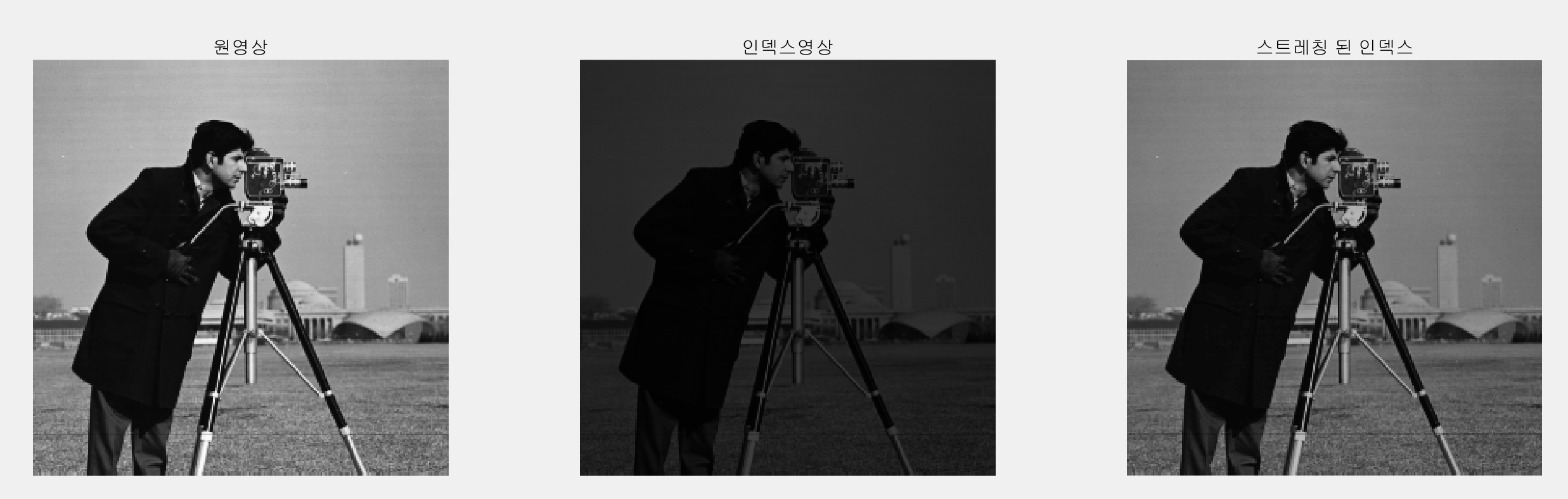 subplot(1,3,3); imshow(new_x); axis tight, title("스트레칭 된 인덱스"), figure % 스트레칭 된 인덱스