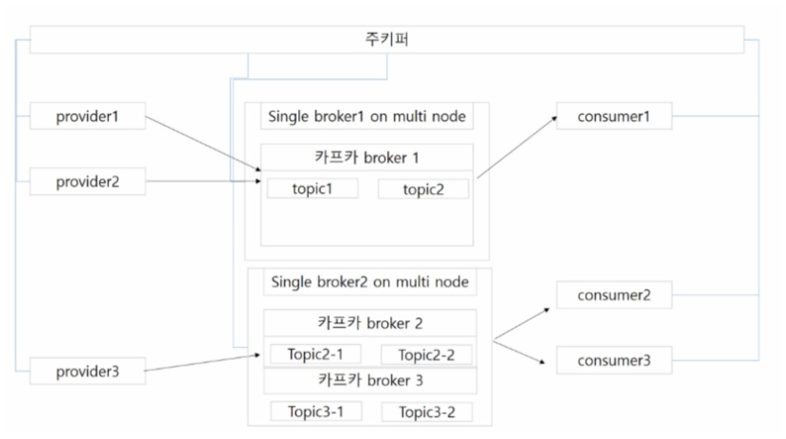 | 주요 구성 요소 | Broker | 카프카의 서비스 인스턴스로서, 다수의 Broker를 클러스터로 구성하고 Topic이 생성되는 물리적 서버 |