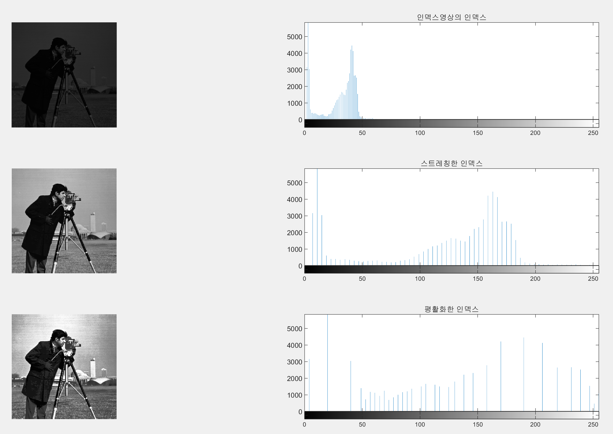인덱스 함수의 인덱스 영상은 한쪽으로 편향되어 있는 히스토그램을 보여주고 있습니다. 스트레칭 함수를 적용한 결과 그레이 스케일이 전체적으로 퍼져서 대비가 좋아진 모습을 볼 수 있습니다. 평활화 함수를 사용한 인덱스 영상은 한쪽으로 몰려있던 히스토그램의 빈도수를 전체적으로 퍼트려서 대비를 좋게 하였습니다. 스트레칭 함수에 비해 전체적으로 히스토그램의 높이(빈도수)가 비슷해진 것으로 스트레칭 함수와 차이를 확인할 수 있습니다.