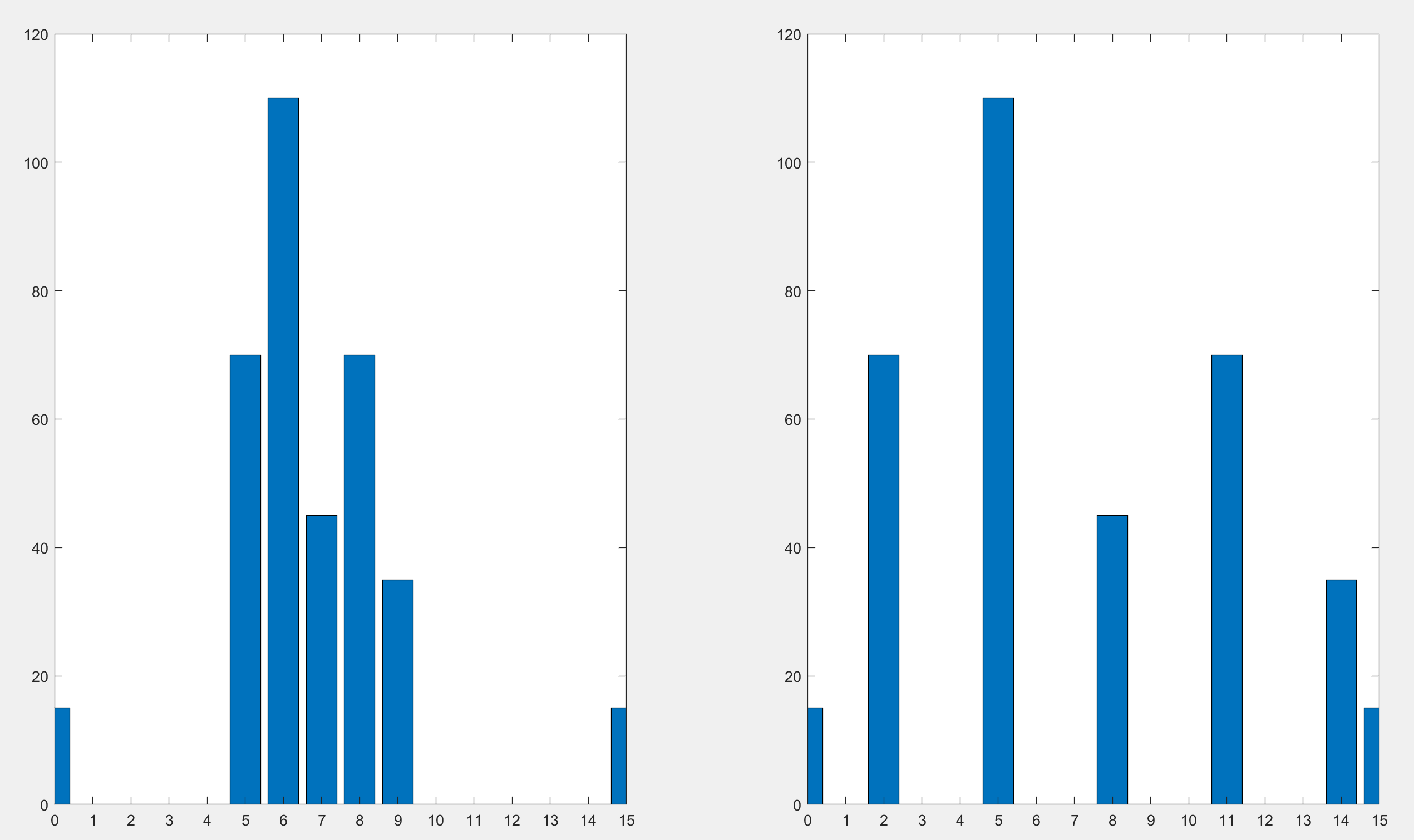 subplot(1,2,2), bar(x, y1),xlim([0, 15]), set(gca, 'xtick', 0:15);
