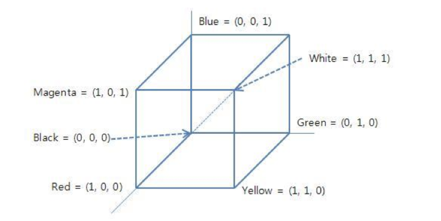 RGB 모델은 빛의 삼원색인 빨강, 초록, 파랑을 기본으로 한 모델입니다. Red는 (1,0,0), Green은 (0,1,0), Blue(0,0,1)로 두고 모든 색이 섞였을 때는 (1,1,1)인 흰색, 모든 색을 없애면 (0,0,0) 검정색입니다. 또한 Red, Green을 섞으면 Yellow, Red와 Blue를 섞으면 Magena, Blue와 Green을 섞으면 Cyan이 나옵니다.