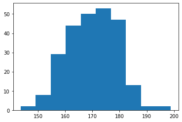 x = np.random.normal(170, 10, 250) # 무작위 값 생성, 기준은 170, 표준 편차 10에 250개의 무작위 값을 생성합니다.