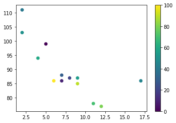 다음은 x- 포인트, y- 포인트, 색상 및 크기에 대해 100 개의 값이있는 임의 배열로 나타낸 예시입니다.